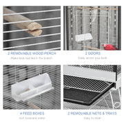 Your feathered friend will love the roomy interior and attention to detail of this indoor or outdoor aviary bird cage . With plenty of space and added accessories including multiple feed boxes and wooden perches, there' always room to perch and play. Two large front doors allow quick access to your birds and to the bottom tray for easy cleanup. Built with durable iron with a pet-friendly finish, this cage will provide years of use and enjoyment. The cage is covered in 0.5'space metal wire to keep your birds away from escaping and outside predators. A metal stand with 6 easy-rolling casters lets you enjoy your bird anywhere you go.